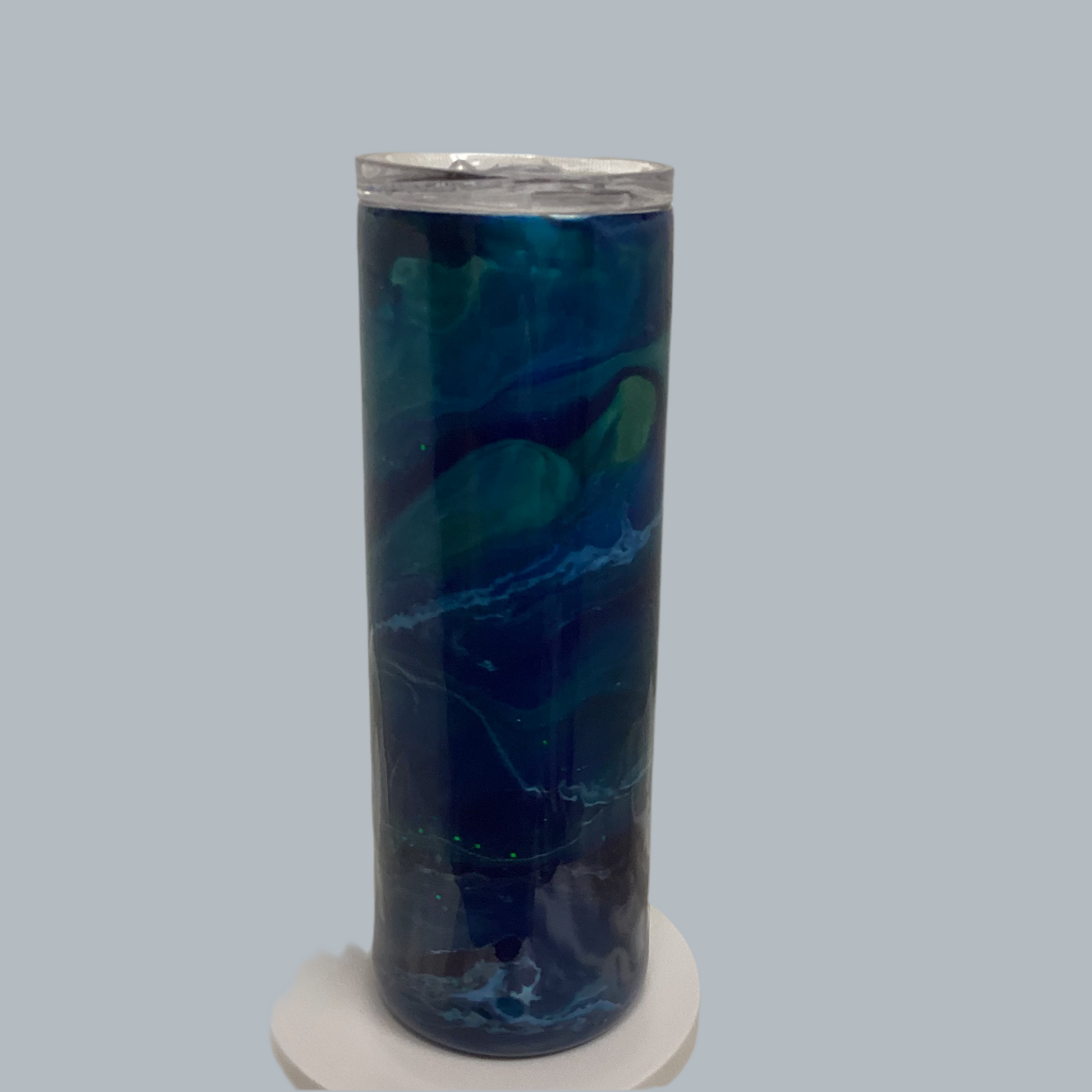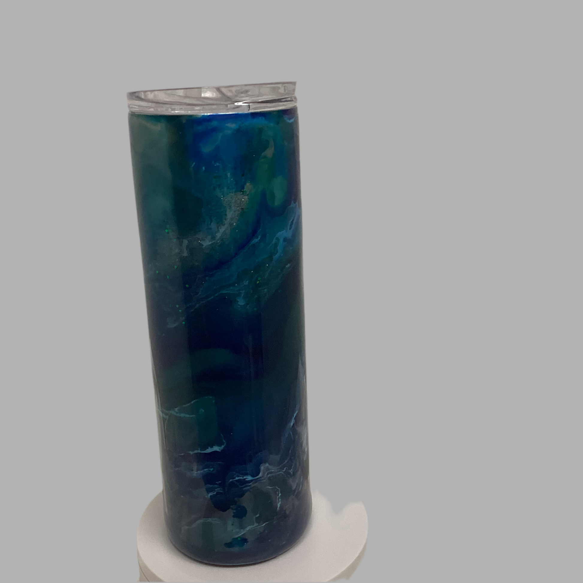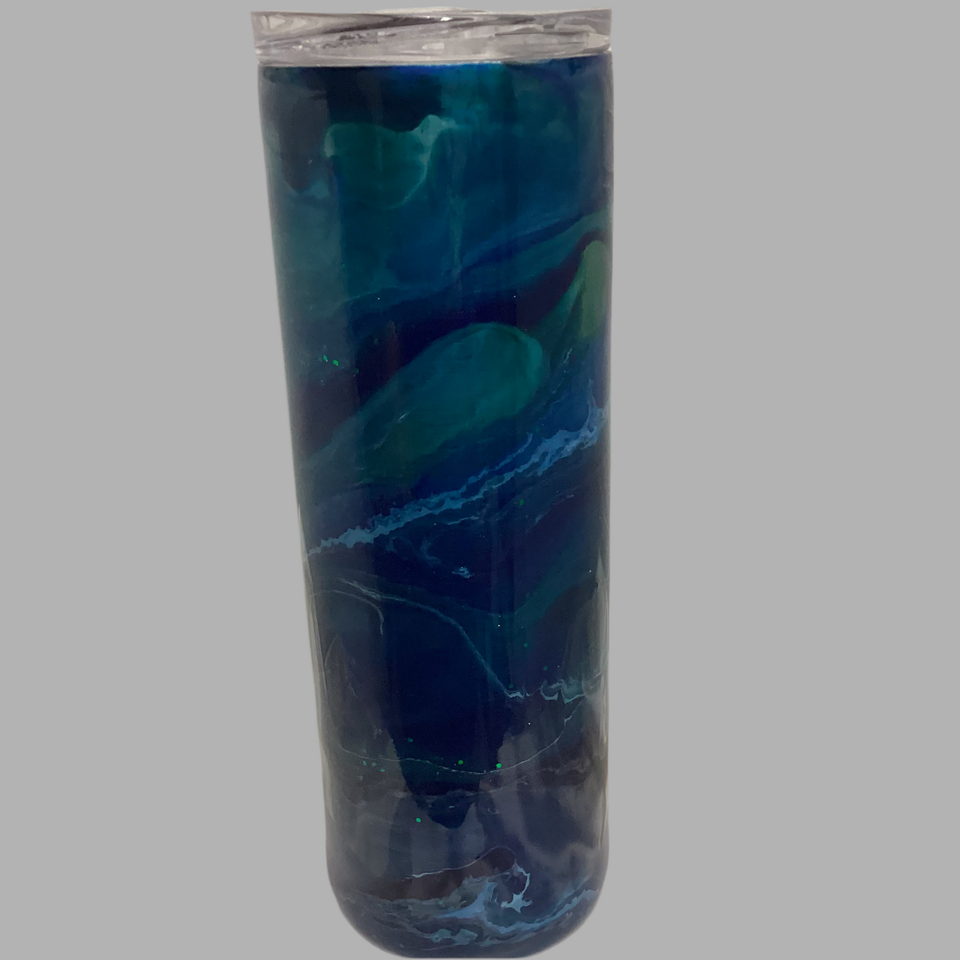 20 oz. Stainless steel tumbler with blues and turquoise.
