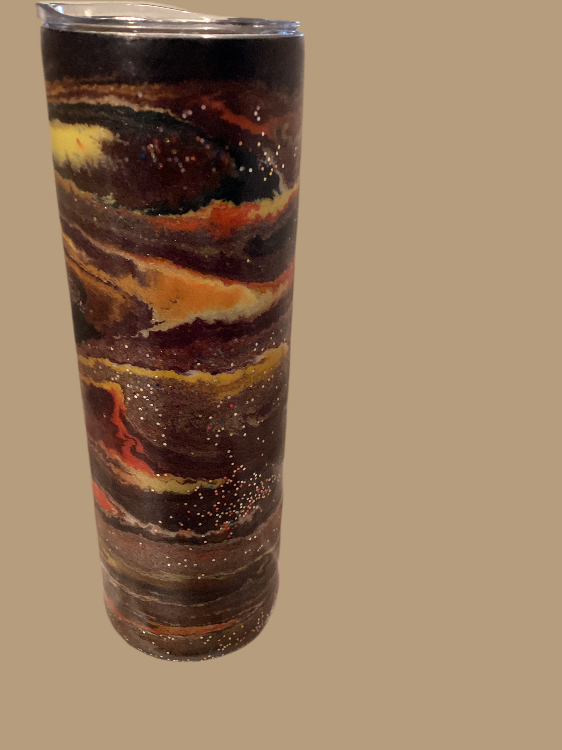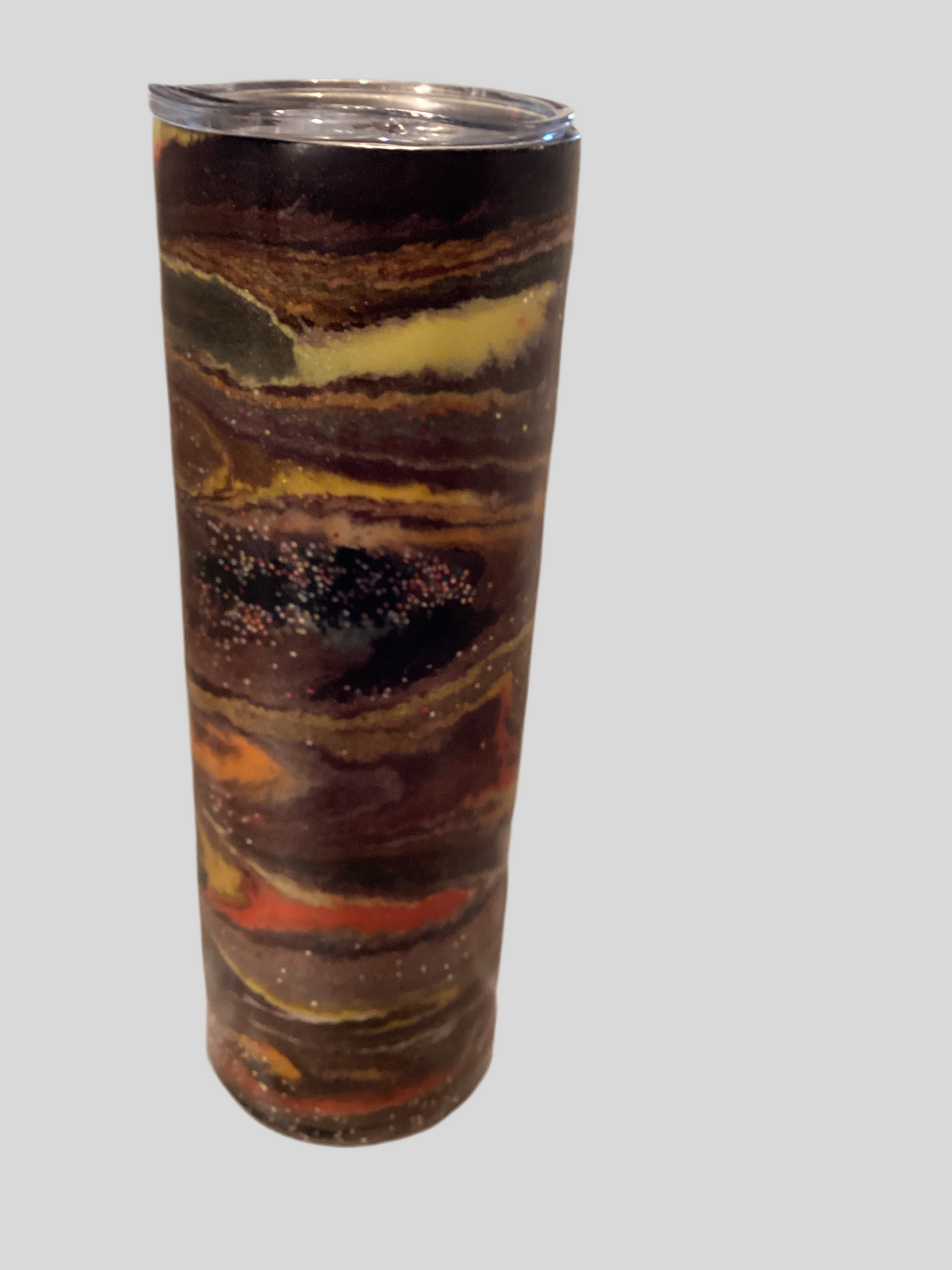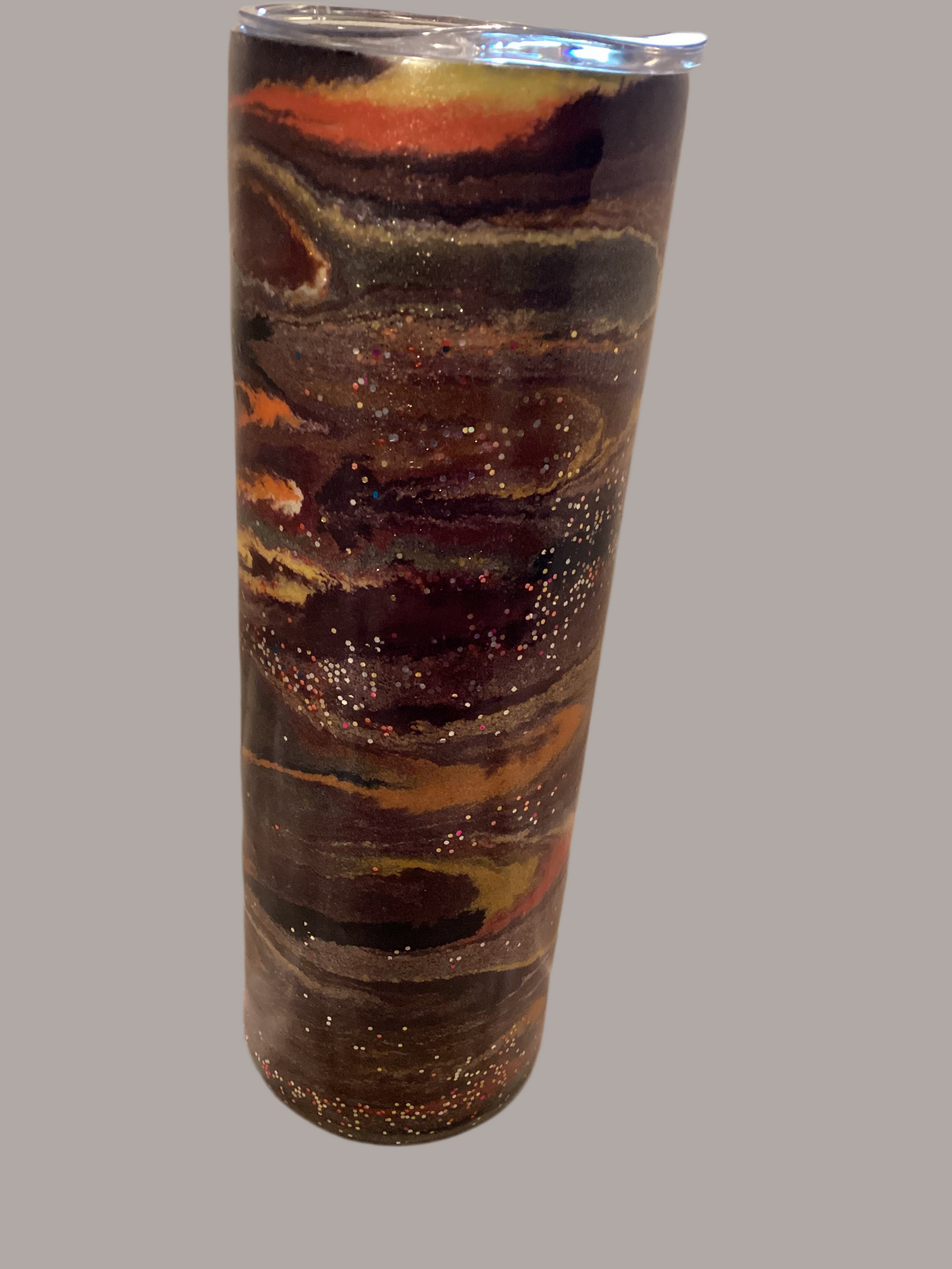 30 oz. Stainless steel tumbler with browns,orange,yellows and silver
