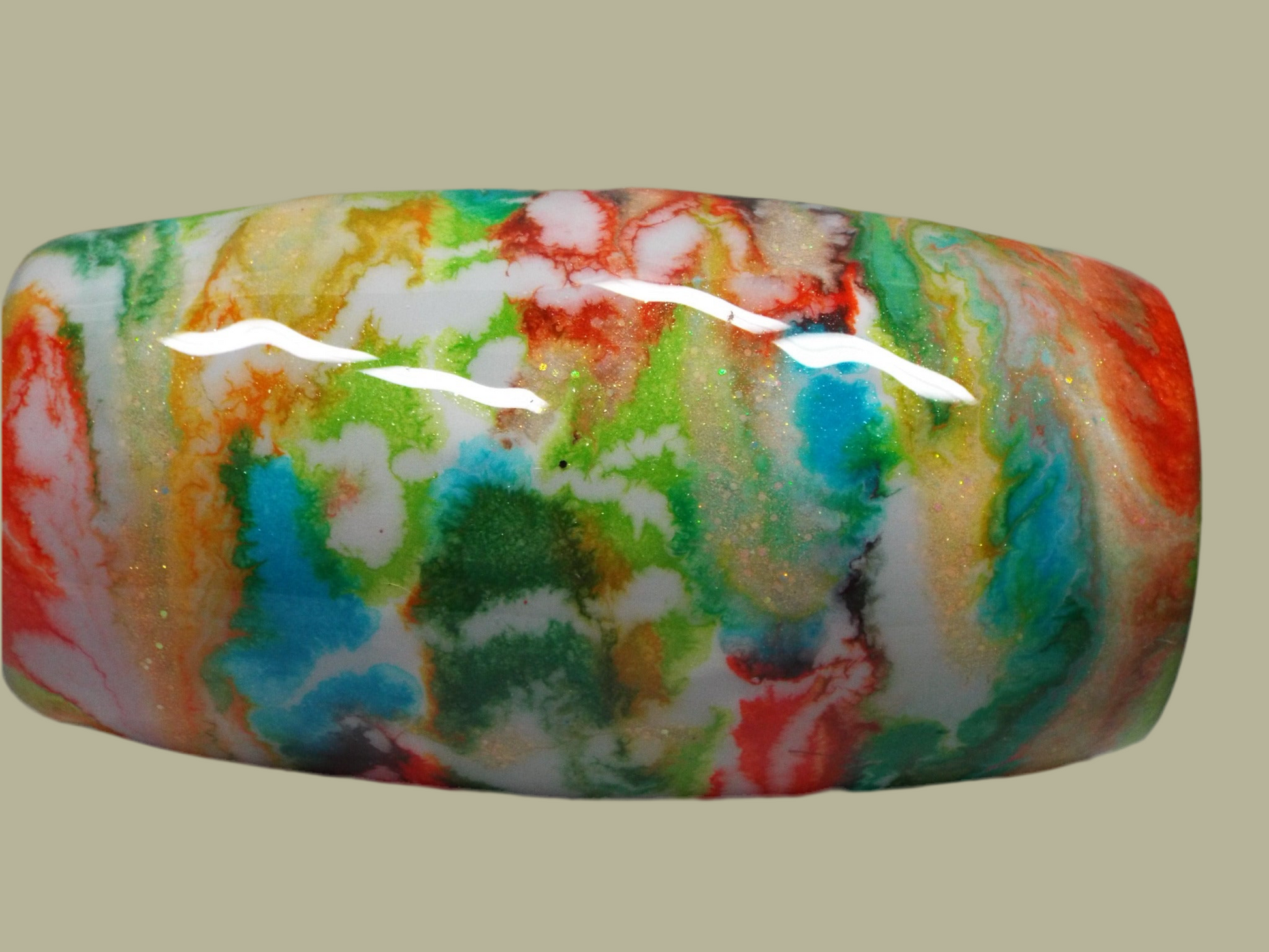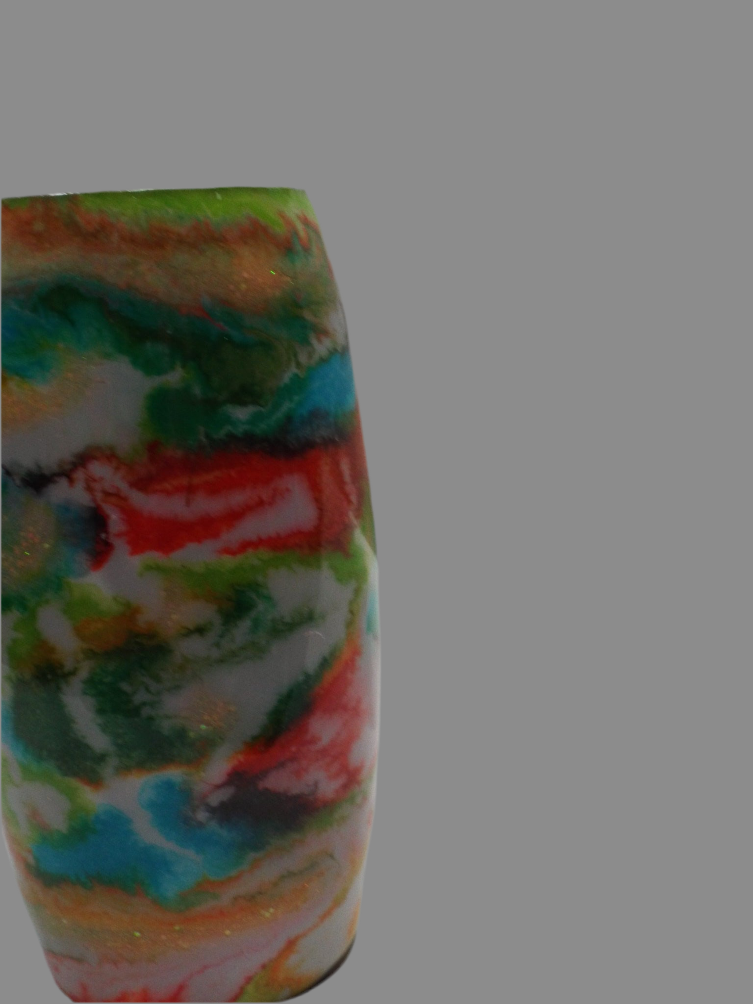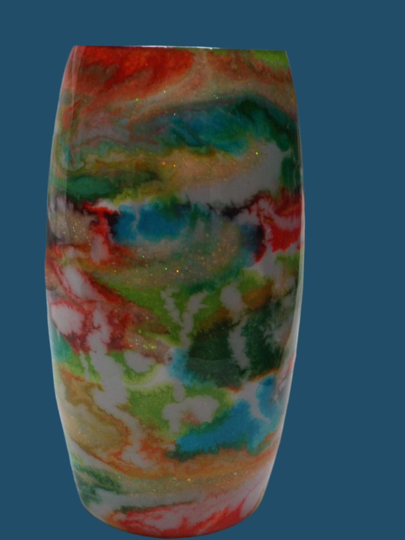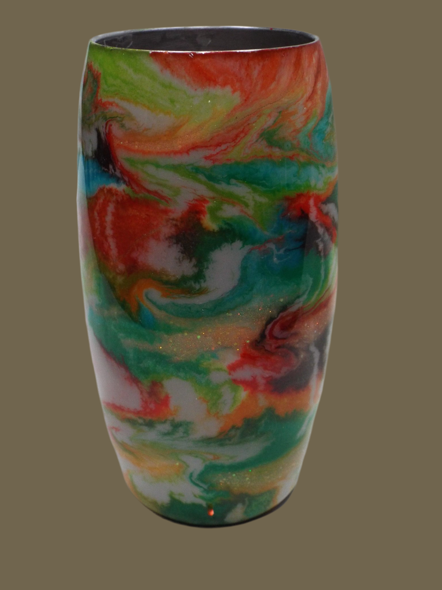 25 oz. Stemless football shaped tumbler with oranges, greens,blues,reds and whites