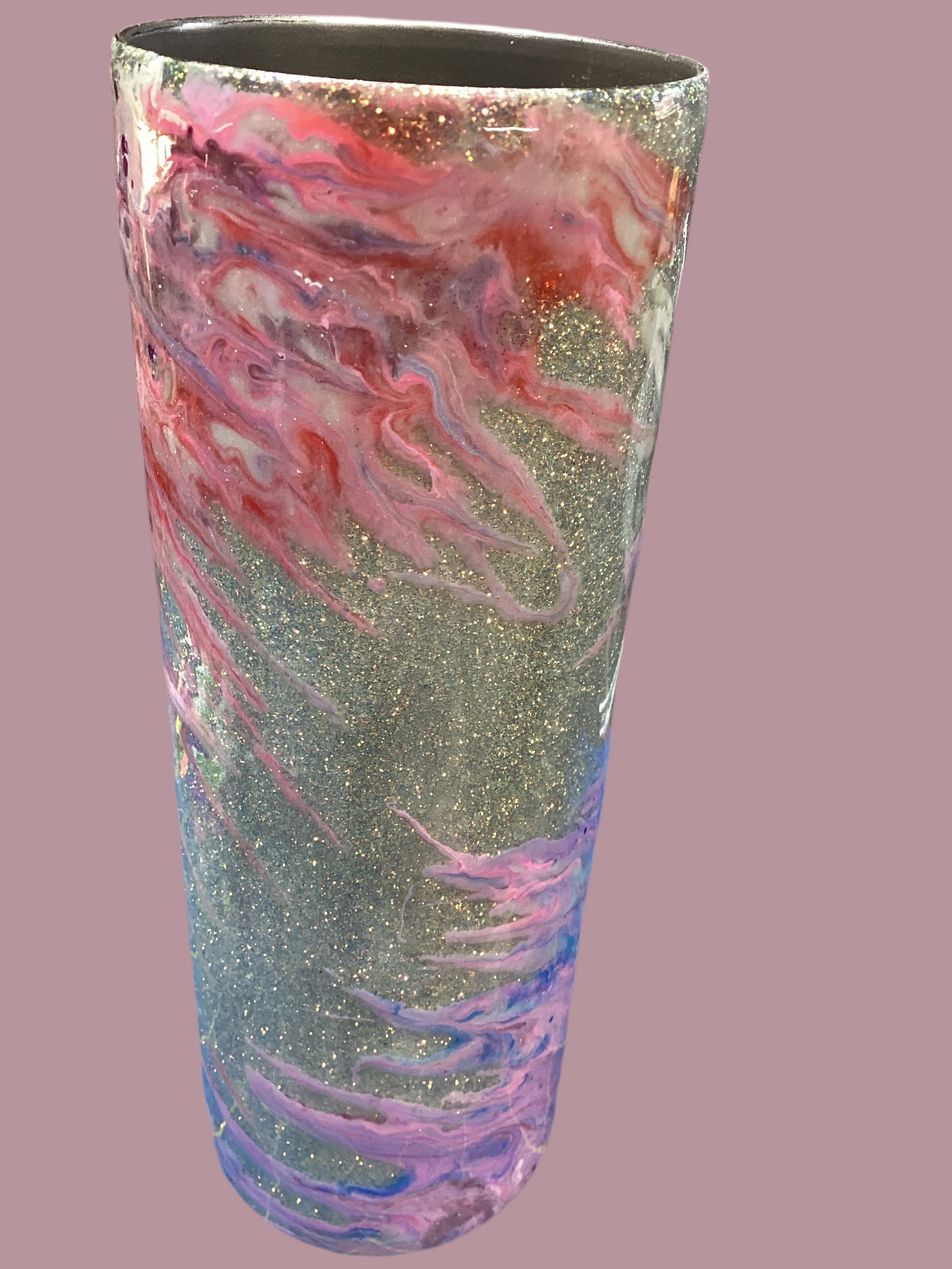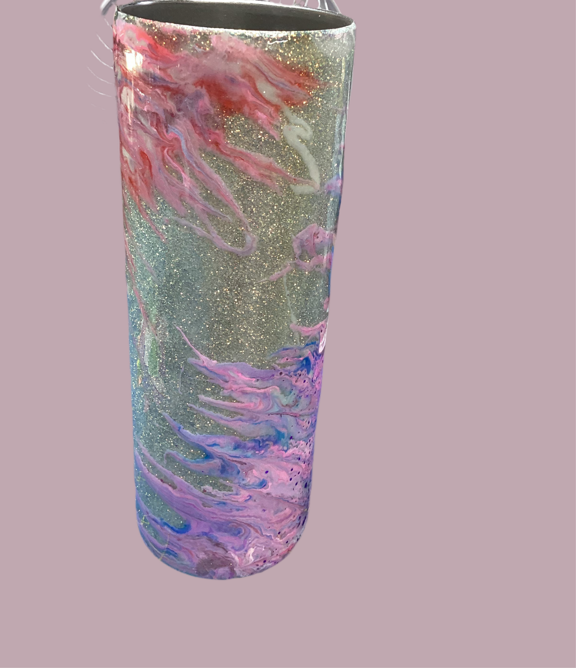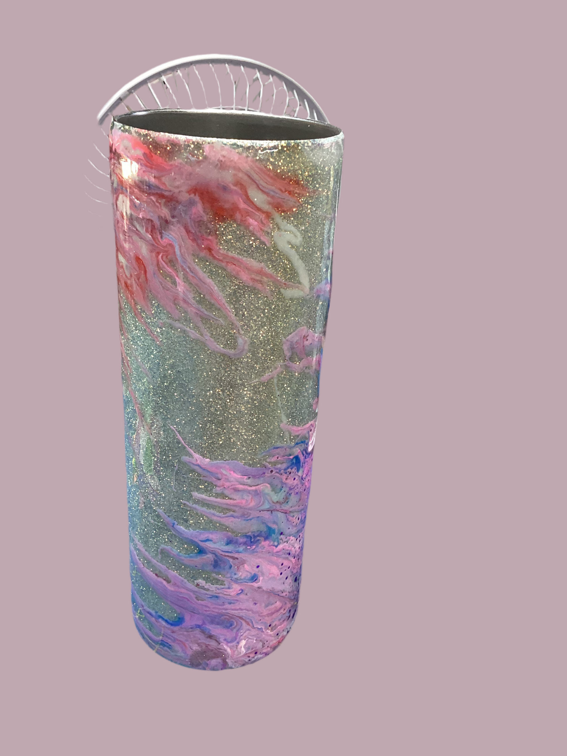 20 oz. Stainless steel tumbler with golden glitter base with twisted stinger design in pinks, purple and white.
