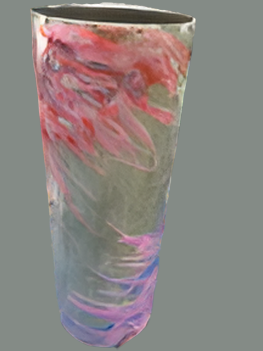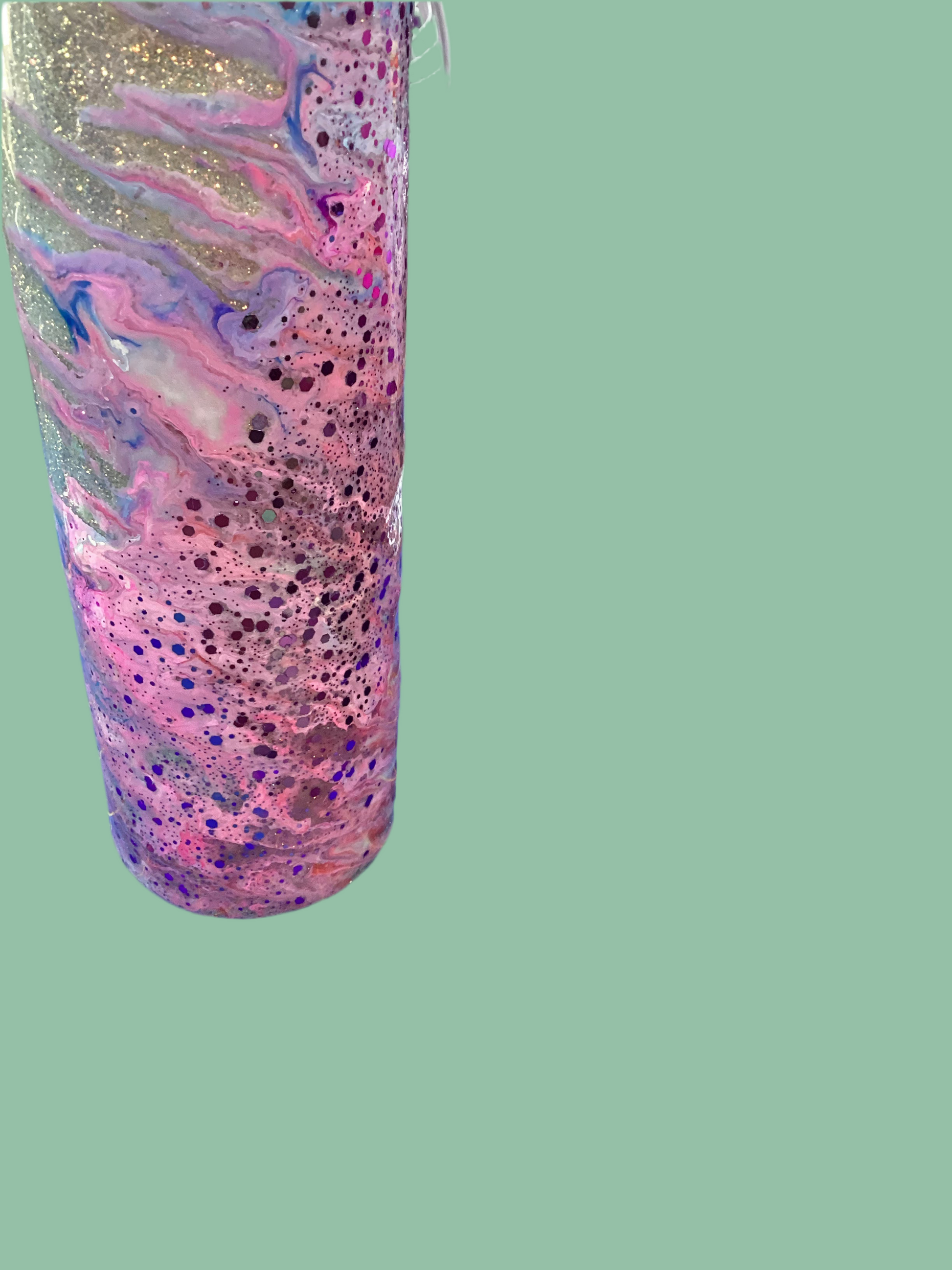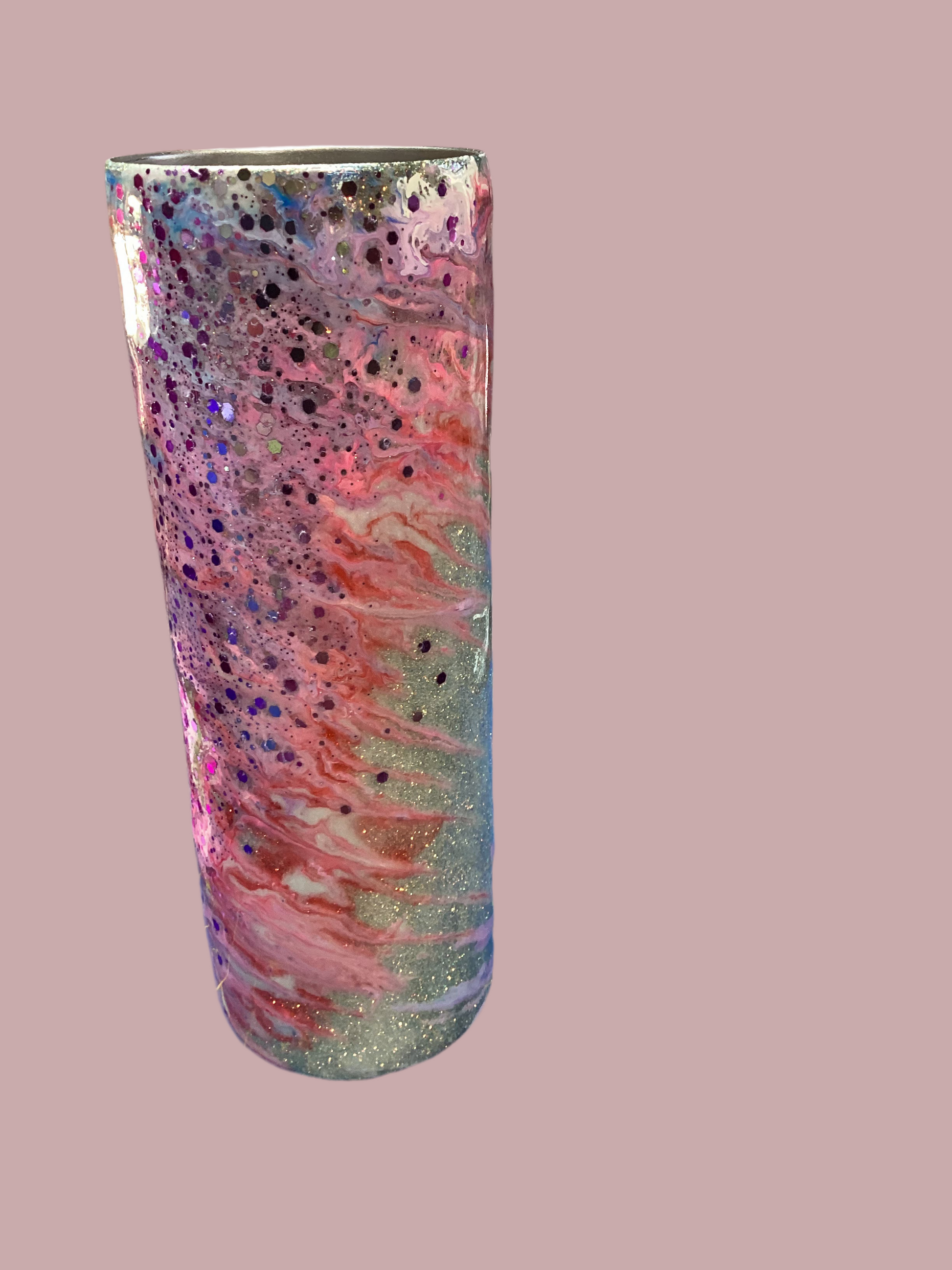 20 oz. Stainless steel tumbler with golden glitter base with twisted stinger design in pinks, purple and white.