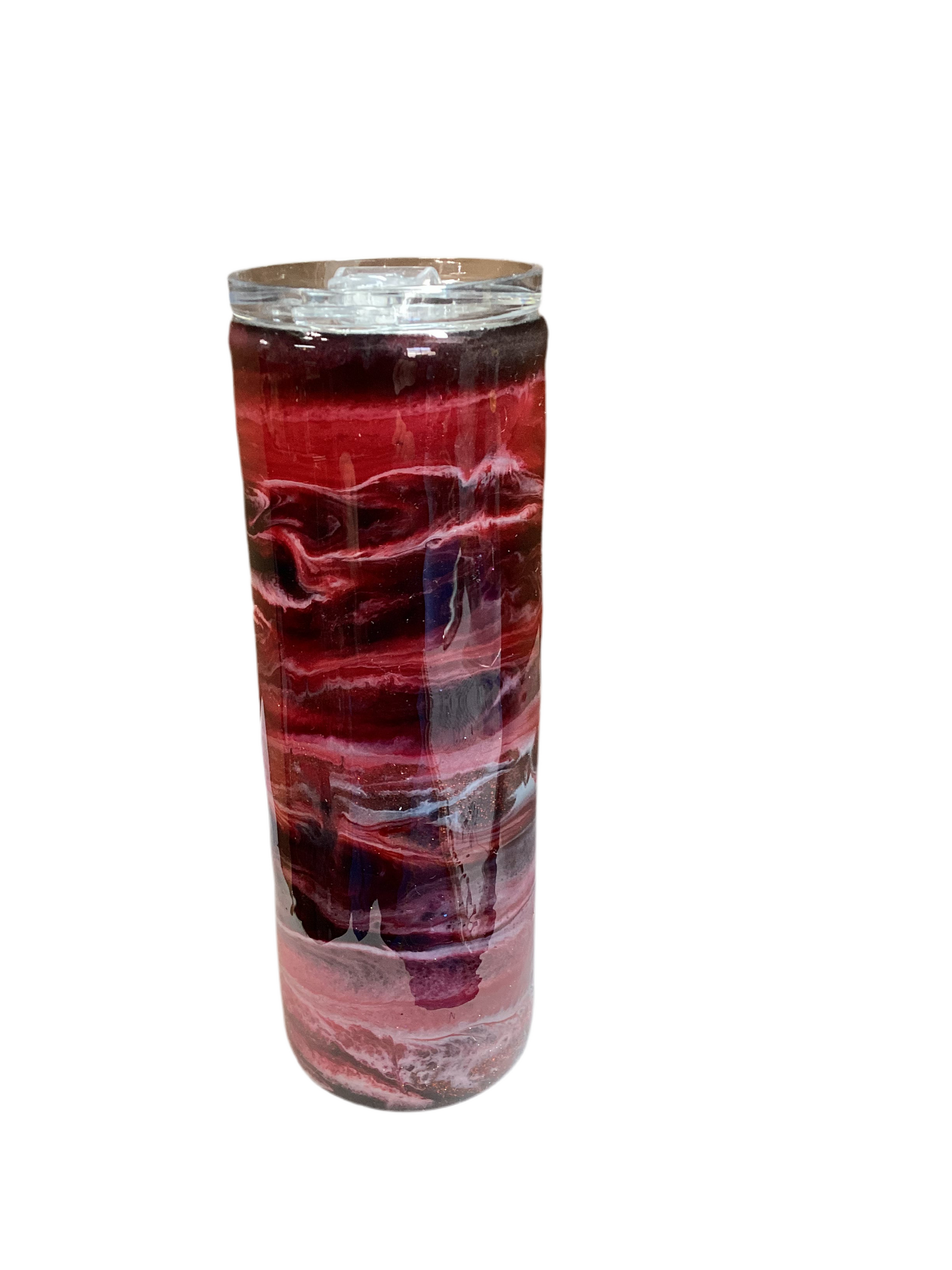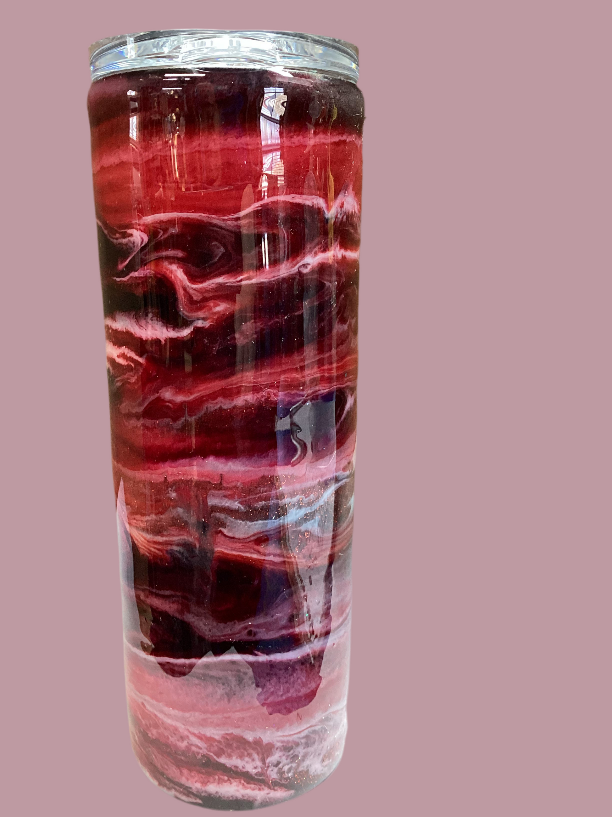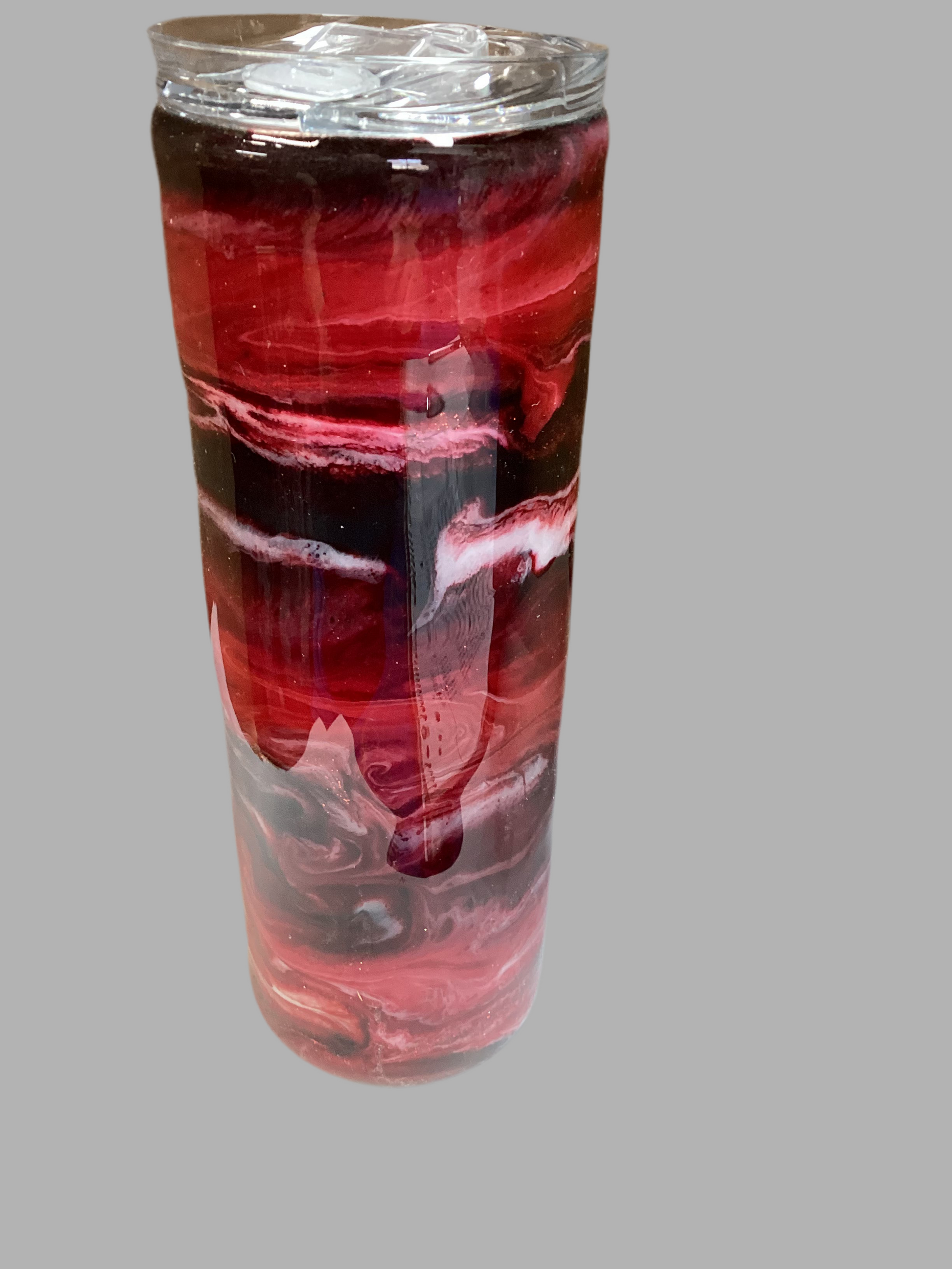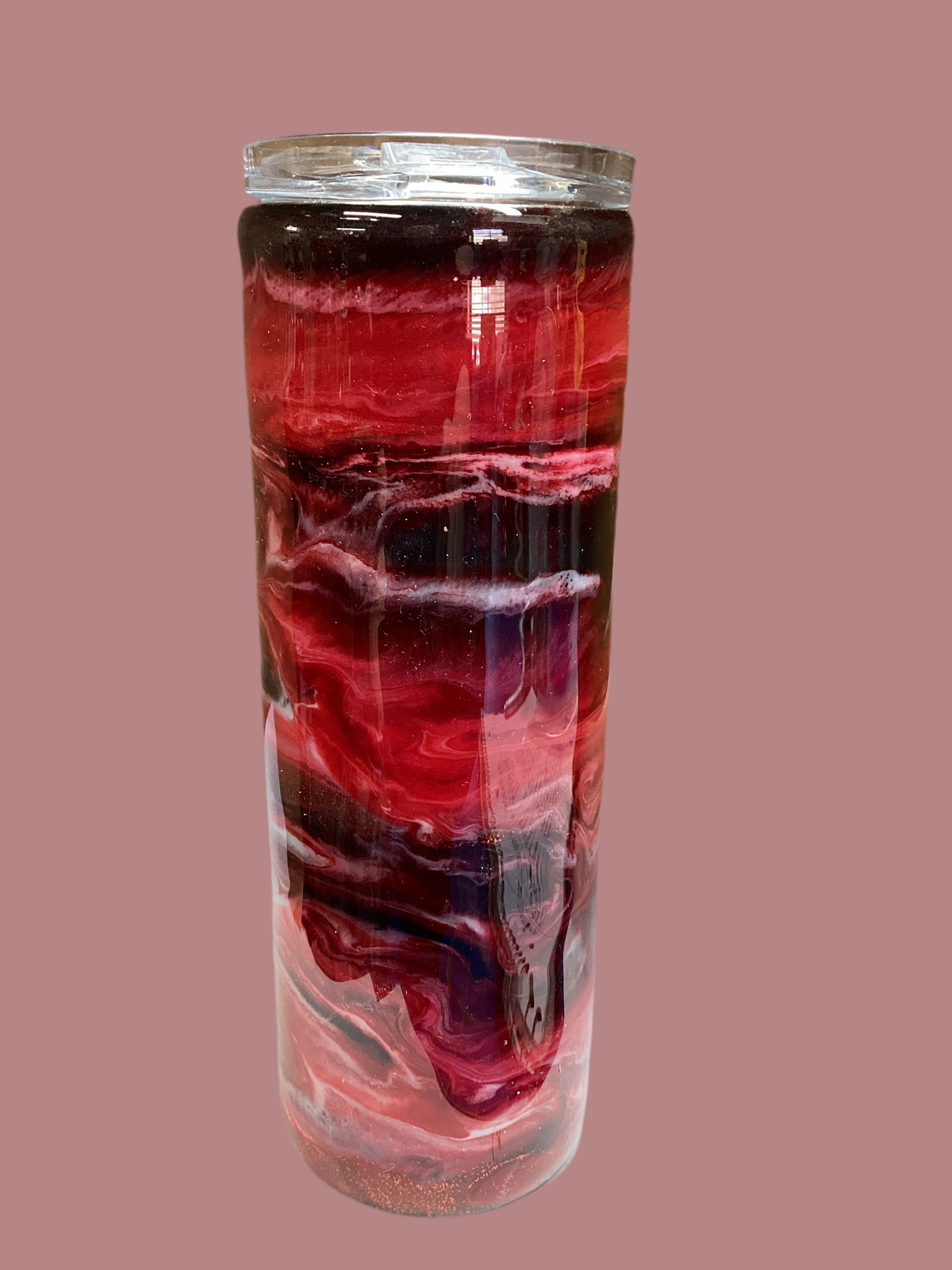 20 oz. Stainless steel tumbler with beautiful reds, blacks and white swirls, glitter